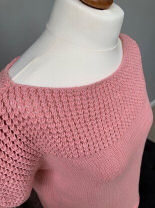 This top is knitted seamlessly from the bottom up and then divided into two pieces at the armholes. Each side is then worked flat with an I Cord edging and joined at the shoulders. It is designed to be worn with positive ease and has a repeating lace detail which resembles little rosebuds.