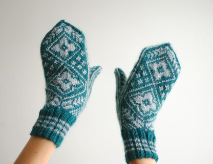 Yarn Telespinn Symre (80% kid mohair, 20% lambswool, 165 yds / 150 m per 50 g skein) in 2 colors; Yarn Color A: S330 Sjøgrønn (1 skein) Yarn Color B: S010 Lys grå (1 skein)