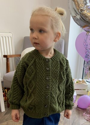 Instructions are given for the DK cardigan in four sizes 1-2, 2-3, 3-4 and 5-6 years. The cardigan is knitted in a design inspired by the Aran islands. Instructions are given for two different front and sleeve panels, “Zig- Zag” and “Diamond”, making this pattern suitable for boys and girls.