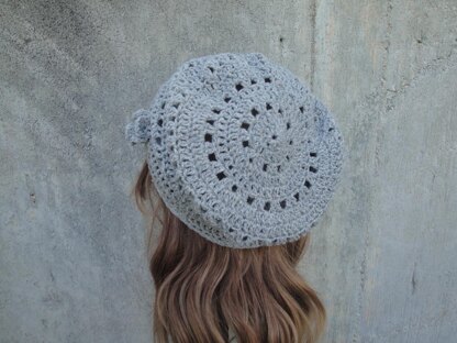 Worked from the top down, Roslyn is a chic slouch hat with a pretty lacy pattern on the back and comfortable, slouchy fit. A quick project and very versatile hat, appealing to women and teens alike. Wear it up as a loose beanie or back as a slouch…. Skip the flower for a simpler look, or attach several for extra fun! 1 skein of Cascade Roslyn will make 2 hats. Skill – easy Size: Small-Average, Average-Large 20-23”, 21-24” circumference x 10” long Yarn: 1 skein Cascade Yarns Roslyn (382y/100g; 65 wool & 35 silk) #17 Silver Hook: G/4mm & F/3.75mm, or size needed to obtain guage Gauge: 16 sts and 4 rows = 4” in double crochet on larger hook