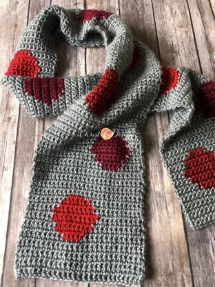 I am in love with the Rossi Scarf, the simplicity, the style, it's just perfect with a pop of color and interest in those dots. I love how customizable this scarf is, and what a stash buster it can be. I had a really specific idea of the colors I wanted to use for this scarf so I went with Caron Simply Soft because they have all the colors. The three reds (Rossi, in Italian) I chose are a beautiful compliment to one another. Also, I knew CSS would give this all single crochet scarf gorgeous drape. This written pattern also includes a separate color chart, and a video demonstrating the color changes/carry I used. Materials: 400 yds #4 med worsted weight yarn total. I used Caron Simply Soft* 350 yds in Heathers Grey (main color-mc) and about 50 yds between the three reds: Harvest Red (CC1), Burgundy (CC2) and Autumn Red (CC3) (CC-contrasting colors). 5mm hook* Yarn needle* Measuring tape* Scissors*