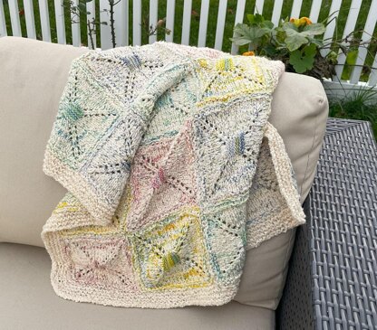 This adorable baby blanket is a perfect way to use up leftover bits of sock yarn. Each square is worked from the center out beginning with a small square worked in sock yarn. The main color is then added, and with the strands held together, squares are knit in the round from the center out.