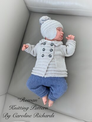 A stunning 4 piece cosy set, perfect for winter, The double-breasted cardigan is knitted flat from the top down on straight needles, so requires minimal sewing. The trousers are knitted in a similar way so minimal sewing is required and fewer seams, making the outfit comfier for the baby. The booties and bobble hat complete the outfit and knit up quickly.