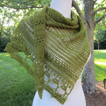 Rowena is a scalene triangle beginning with 2 chains and gradually increasing to its full size. It is finished with a wide, ornate edging. The pattern has rows of easy repeats followed by ornate rows to add interest while crocheting.