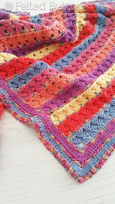 Little Rows of Posies separated by a shimmery and colorful variegated yarn makes for a sweet and happy blanket. Bust your stash or use the colors shown in the sample.