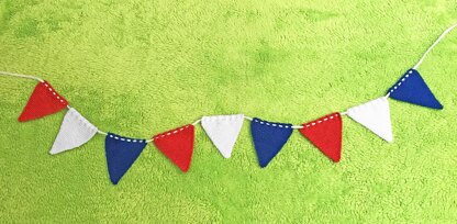 This pattern is of a royal flag style bunting garland. The garland features nine flags in red, white and blue.