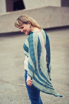 Royal Mile Shawl begins at the center and is worked outwards to the border. It is worked in sections, alternating two stitch patterns: garter stitch and simple arrow lace. Almost all sections incorporate short rows which give it an asymmetrical shape. The sample shawl is worked in two contrasting colors but would look equally beautiful when knit in a single color. It’s fully charted and has written instructions.
