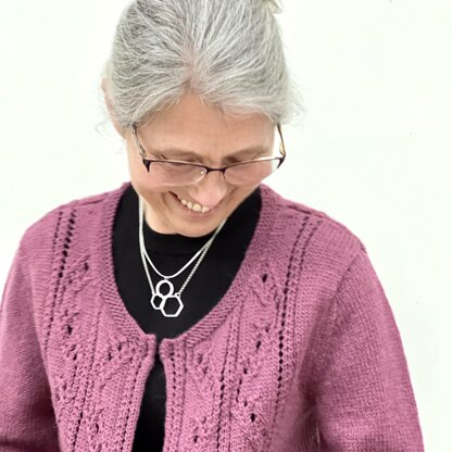 “Ruby is an elegant fitted cardigan with a pattern of flashing gemstones linked by curving lines of eyelets,” says Emma Vining. “The ‘rubies’ are made with extended lines of twisted stitches with a large eyelet centre, with long lines of eyelets separating each set of rubies. The eyelet pattern extends from the cast-on edge to the shoulders and neckline. Each sleeve has a pair of ruby motifs at the cuff, too.”