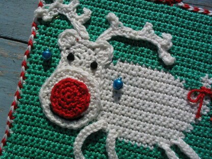 This is an original pattern for a colourful crocheted double thickness potholder with a bouncy Rudolph the Reindeer on the front. The reverse is worked in green, and both thicknesses are joined by a row of single crochet in cream and red.