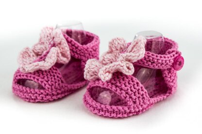 They feature a garter stitch sole, enclosed heel, front and ankle straps that are topped with a pretty ruffle.