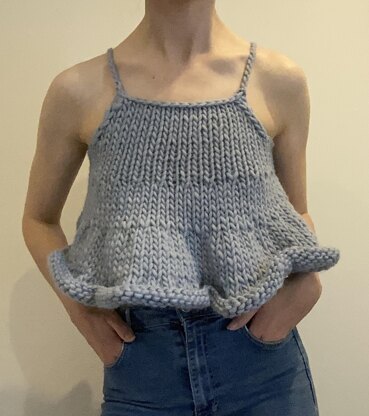 This Ruffle Crop Top is worked in the round from the hem up. The body splits at the underarm for front and back shaping, creating a seamless look, with delicate crochet chain stitch straps.