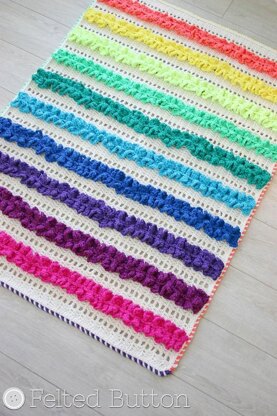 The blanket back is worked in rows with the colorful ribbons joined using your hook. It’s a super quick and simple construction with a fun and textured result. The border is terrifically fun as it changes color along each side.