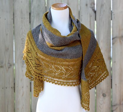 Bring on the fall season with this rustic two-color blanket shawl. The Rugby Shawl is a crescent shawl worked from the neck down in three sizes. It features wide blocks of color reminiscent of sporty rugby stripes and finishes with an intricate lace edging. The applied border has both written and charted instructions. This pattern has been tech-edited and test-knit.