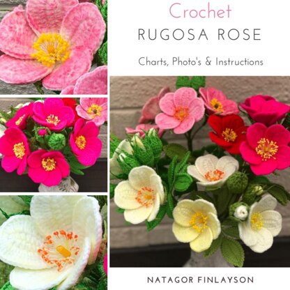 In this Rugosa Rose Crochet Pattern are instructions, charts, photo’s and assembly instructions for a crocheted 3D Rugosa Rose. It contains 29 pages in PDF document format.