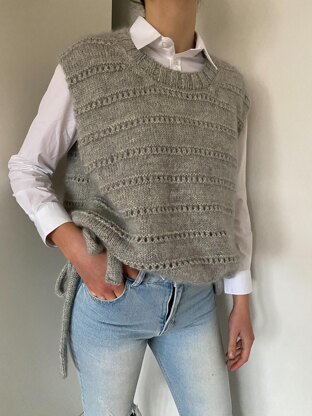The Ruke dotty line is a group of knitting patterns that includes four designs. These four designs have a common yoke and body parts that are worked using the Dotty line stitch pattern. This group contains of two slipovers and two sweaters with different hems. Ruke dotty line knits are oversize hip-length garments with crew neck. All projects are worked from the top to bottom using 4mm circular needles. Wide armholes and the Hem with slits give a free movement. Once the laces are shrinked, garment sits beautifully on the waist and reminds the style of 90’s.