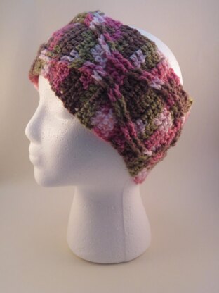 Supplies Earwarmer: less than 1 skein (about 200 yds) Red Heart Super Saver, worsted weight, in Pink Camo I (5.5 mm) hook Yarn Needle
