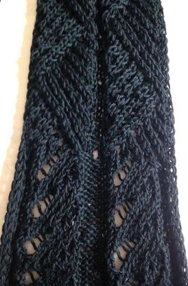 Traveling cables creates a weave pattern. Ends feature a simple lace eyelet pattern.