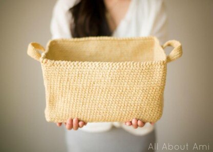Crochet this gorgeous basket using Re-Tweed yarn that has a rustic look to it with its tweed flecks and muted colours. The shape of this basket is unique with its rectangular base and rounded corners. The sturdy straps allow you to carry the basket around and store all your items inside. This basket is a great way to add a touch of sophisticated elegance to your homes! Optional wiring in the edging and an optional cardboard base help to further emphasize the shape and sturdiness.