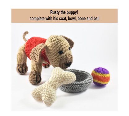 Rusty the puppy dog comes complete with the knitting pattern for his lovely warm coat, dog bowl, bone and ball.