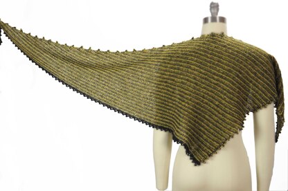This wrap is worked by starting from one narrow point. The stitches increase on one side and decrease at a much slower rate on the opposite edge. This method creates a shallow asymmetrical triangle with one extra-long point to wrap around your neck or pin into place. It’s an easy knit, suitable for any knitter who is comfortable working simple shaping. The stripes are worked in a reversible textural stitch. All rows but one in the pattern repeat are worked as all knit stitches. The pattern provides a straightforward three colour version, as well as enough detail to use it as a base for a stash busting version. The picot stitch on all edges allows for easy finishing, providing a place to bury ends when working with multiple colours