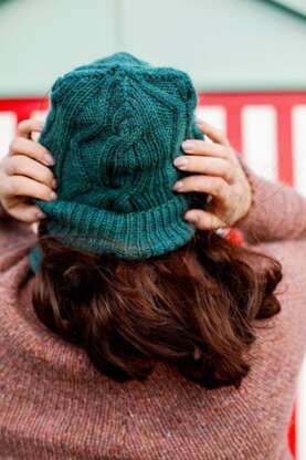 This hat has delightful cables that wind their way from the cuffed brim to the peak, and match the look of the Rye Bay Scarf to complete a set that is reminiscent of flowing water and winding channels.
