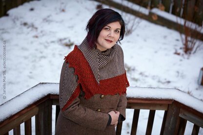Yarn: 1,060 yards/969 meters of a MCN (merino, cashmere, nylon) fingering weight yarn that knits up to 7-7.5 sts/inch in 3 colours. Colours A & B - 360 yards/329 meters of each colour, Colour C - 340 yards/311 meters.