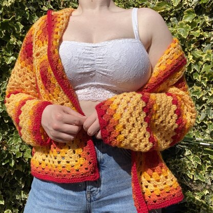 The squares are joined as you go, so there’s no seaming afterwards. The sleeves are worked in the round downwards from the shoulder to the cuff. The hood is worked upwards in one piece and there’s a short seam to close the top of the hood. This seam is worked in ss and can’t be seen, even when the hood is down. This pattern is great for using up yarn scraps.