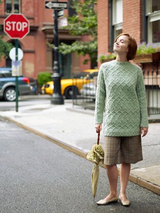 Made from the bottom up, Sage features unusual swirling horizontal cables on the front and back, with delicate diamond traveling stitches on the sleeves. Little Xs grace the lower edge and decorate the neckband.