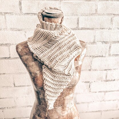 The Sahara Wrap Scarf incorporates dropped stitches for an open woven texture.