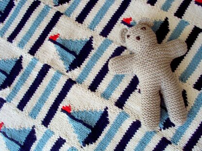 This is a cot blanket with a sailboat motif and stripes in nautical colours. The sailboats are done in intarsia, the rest in stocking stitch. It has a contrast edging. Measurements 64 cm wide x 74 cm deep.Part of a group of knits inspired by the seaside. The pdf has been updated on 28/8/16 to replace one with an error in the chart. The original sample was done in Debbie Bliss Cotton DK. Some of the colours have been dropped so I have changed this to Rowan for close colours. Any cotton dk knitting to the correct tension will work well.