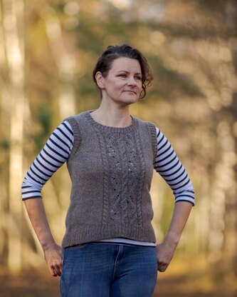 Salla Vest is a stylish vest mixing lace and cable into a textured panel in the middle. It is worked from the top-down, so you can adjust the length easily.