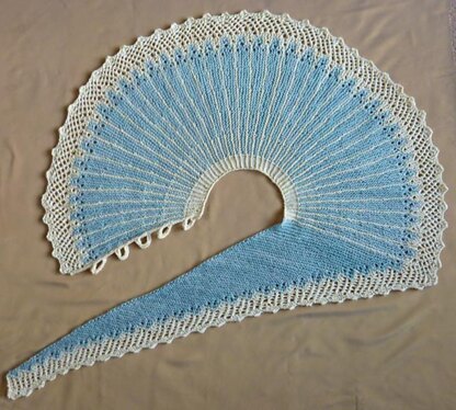 Because of the color changes, this design is more suitable for intermediate knitters or advanced beginners than for beginning beginners. No purling required. Body is worked sideways in garter stitch with the occasional eyelet, while the border uses eyelets and a simple yo, k2tog faggoting for a lacy appearance.