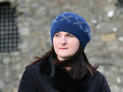 This is a slouchy beret, knitted in the round and worked in one piece from the bottom up. After casting on using a long tail tubular cast on method for 1x1 rib, the brim is worked before commencing onto a beaded section to knit the saltire motifs. This is then followed by the crown shaping of the beret and an I-cord finish.