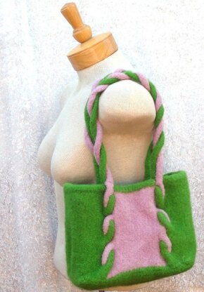 Lamb's Pride Bulky felts up to a wonderfully thick fabric that make up the simple and fun style of the Saltwater Taffy Bag. In pink & green it's a candy-colored confection. This pattern includes intarsia and cabling.