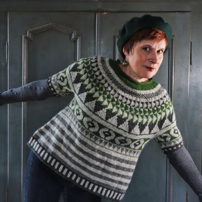 Featuring a rolled neckline, stranded colourwork, knitted top-down and seamlessly in the round, with short or long sleeves and optional side shaping for an exaggerated A-line silhouette, this sweater is inspired by a twelfth century mosaic pavement in the Basilica of Santa Maria e San Donato on the Venetian island of Murano.