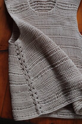 Sand is worked from bottom-up on two separate panels. Texture created from the Tunisian knit stitch alternated with the tunisian simple stitch. The yarn used is 100% cotton. The result is a top with a good fit and very fresh, which can be used as an overlay or as a single piece.