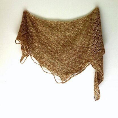 Sand is an asymmetrical triangular shawl worked from the right corner to the left side edge. Double decreases shape the wavy edging worked along the length of the shawl on the right side and an i-cord bind-off creates the loops on the left. The asymmetrical triangle shape is created by increasing two stitches at the beginning, and decreasing one stitch at the end of each right-side row, making a curved, triangular shape.