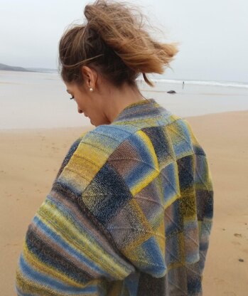 As the individual squares of the main panels are formed by knitting on to others, it minimises the need for stitching / running in of final ends and produces a beautiful flat garter stitch fabric. The garter stitch ridge theme is also worked throughout the mainly stocking stitch sleeves which continue along the shoulder to the neckline.