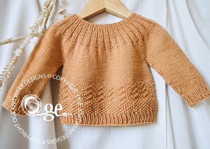 This sweater is knitted top down to the underarm, sleeves stitches are then put on hold, and worked after the body is complete. The body has a simple textured pattern running around the body. The pattern has been graded as suitable for the Advanced beginner or Intermediate knitter.