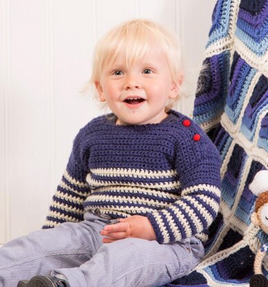 Ideal for a beginner looking for their first baby / toddler garment. This classic breton stripe jumper is a preppy take on the nautical theme. It is designed to be roomy, with plenty of positive ease so you can pull it on over a t shirt on cooler days. The sleeves can be worn turned back if needed. The boxy, relaxed shape has no shoulder shaping and only basic crochet skills are needed. This jumper can be made in any DK weight yarn, be sure to check tension if substituting. You will need 3(3,4,4) balls in main colour and 2(2,3,3) balls in contrast colour.