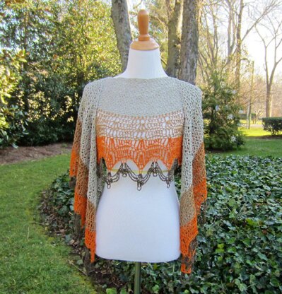Sandra's Wrap is a lacy, linen wrap worked sideways for the top section. The lacier edging is added last and worked back and forth along the lower curve of the wrap. The curve in the wrap is created with short rows.