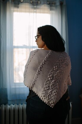 Sandrina is a long asymmetrical triangle shawl with narrow cable and bobble motifs and a center lace, cable, and bobble panel. The shawl is worked flat from one corner and finished with a bobble bind-off.