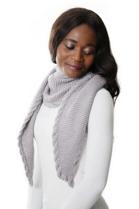 This shawl knits up quickly in an aran weight yarn, using garter stitch and cable edges for a more interesting knit. This shawl was inspired by the need to knit shawls which younger people can appreciate and incorporate into their wardrobes.