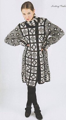 Striking coat, single breasted with asymmetric fastening, and long sleeves inspired by traditional Sanquhar patterns. It is knitted flat in 5 panels for the body, plus the sleeves and the collar.
