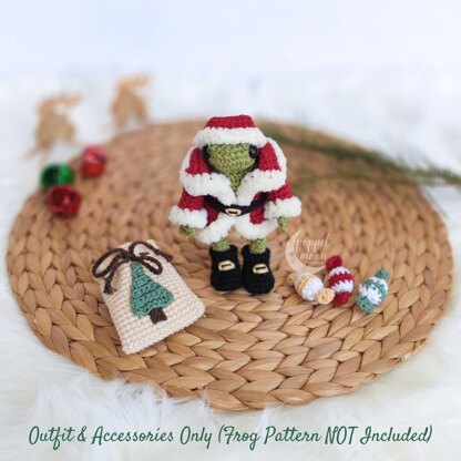 Santa Outfit for Frog with Santa Sack and Christmas Candies Crochet Pattern (FROG PATTERN NOT INCLUDED) Dress up your tiny frog in this adorable Santa outfit, complete with a Santa sack and sweet little Christmas candies! But be careful, he might just make your heart melt right out of your chest from cuteness overload! The 9-page amigurumi crochet pattern for the Santa outfit, Santa sack, and Christmas candies is easy-to-follow and includes clear, detailed instructions, along with plenty of pictures so you can whip each item off your hook in no time at all! Please note this pattern is designed specifically to fit the tiny frog (not the toad).