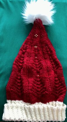 As the Christmas season approaches, thoughts of white-brimmed red hats with tails of decreasing width come to mind. Rather than buy a head-covering of unknown materials and manufacture, why not knit what will surely become an heirloom and a treasured gift? This pom-pommed take on Kris Kringle's topper features an easy cable, a well-known gansey motif and beads worked on a stockinette/stocking stitch background. Warning - this hat may prove so popular among all of your friends and family who see it that you will be asked to knit more than one! Written and charted instructions are provided. Also offered are instructions as to how to enlarge or reduce the desired head circumference by an inch or a few centimeters.
