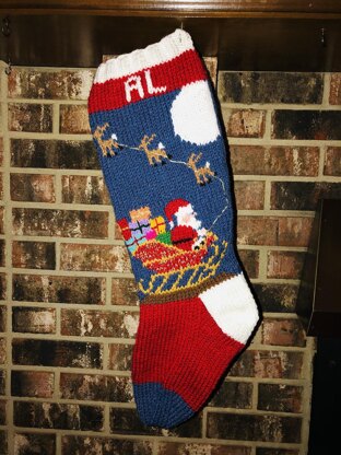 Santa and the reindeer flying through the Christmas sky. Knit this adorable Santa stocking for any lucky recipient.