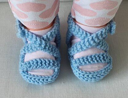 These 8ply garter stitch, sling back sandals have crossed, buttoned foot straps, and a toe strap knitted sideways.