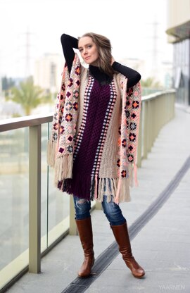The poncho is a rectangle with an oval neck opening. First, you work two stripes made of granny square motifs joined together as you work their last round using the single crochet join-as-you-go method. Then you add stripes working in rows lengthwise along the granny square stripe’s edges, leaving a hole for the neck opening. To leave a hole for the neck opening, you break your work in two at the specified point, work the front and the back parts separately, then join them together in the center front/back of the garment.
