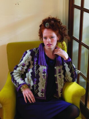 Vertical stripes are perfect for this traditional flower and create a flattering jacket shape. A two colour garter stitch edge and collar compliment the delicate print.